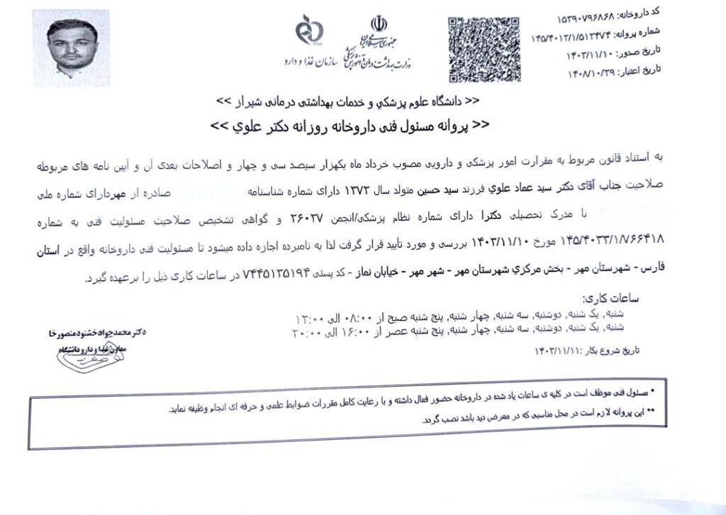 مجوزهای داروخانه دکتر علوی